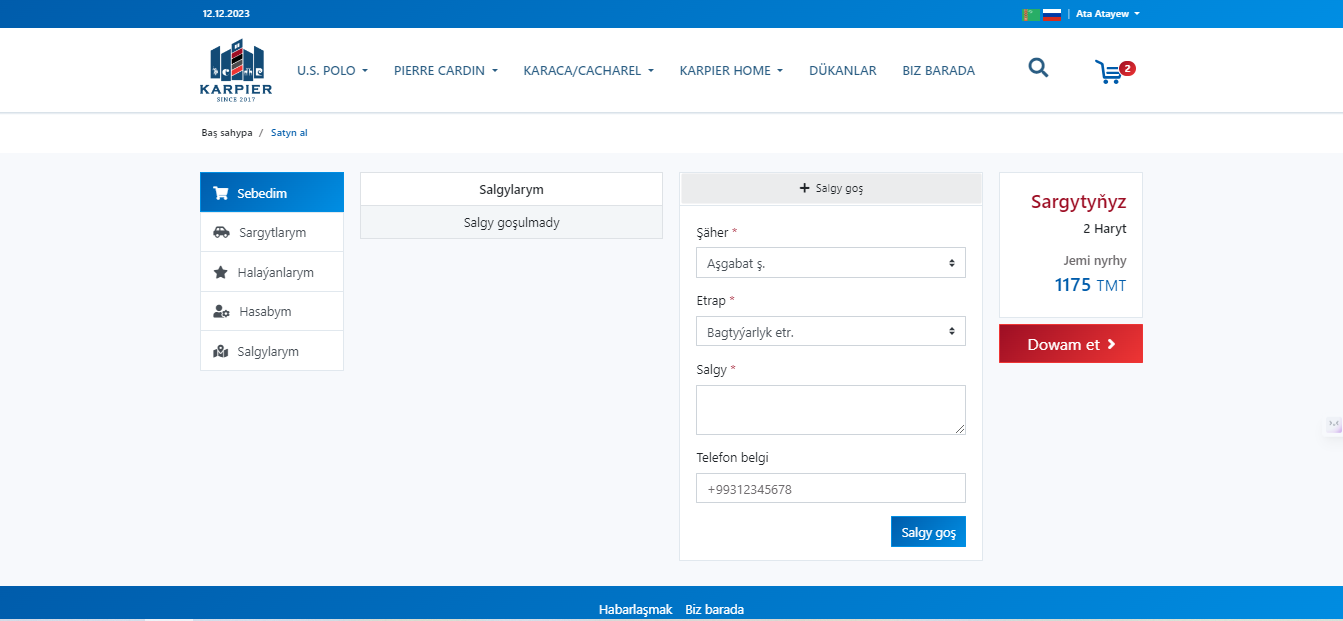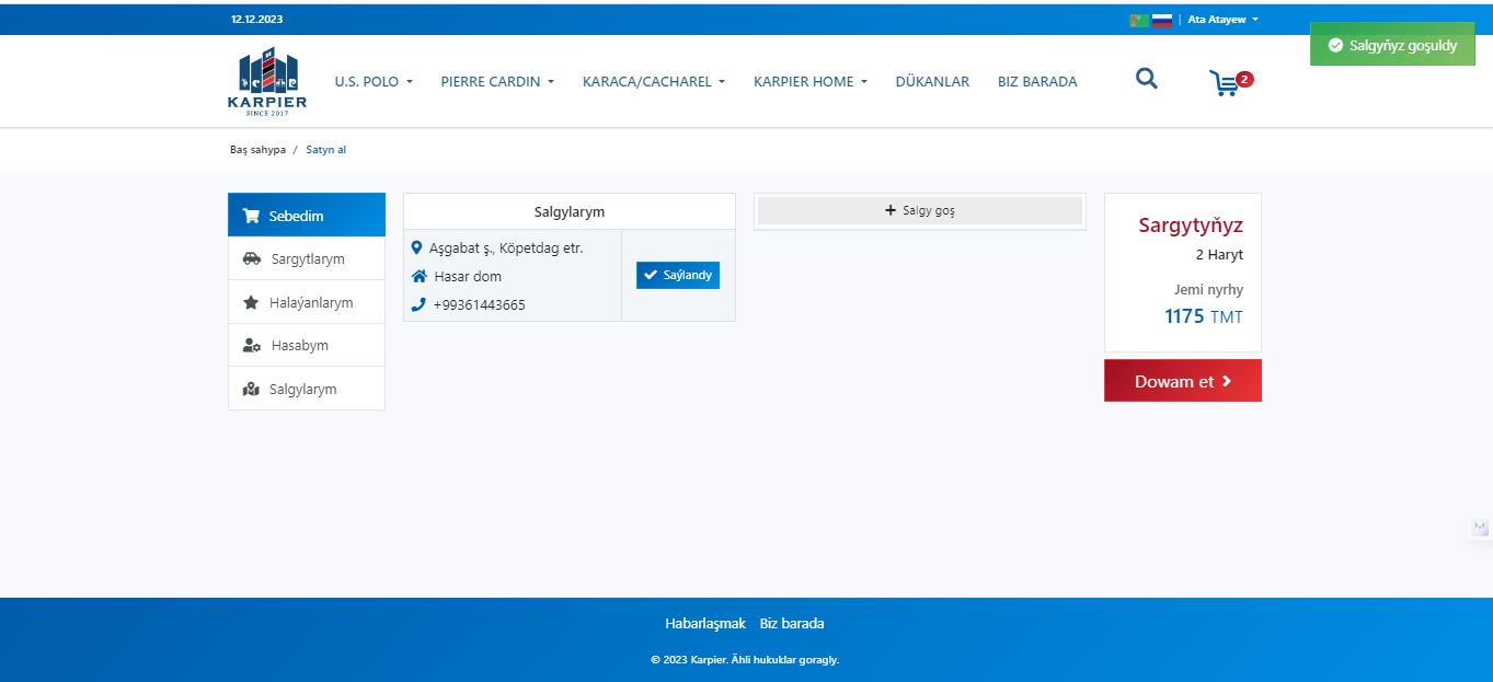 Salgyny goşup, satyn almak hereketini dowam etmek üçin "Dowam et" düwmäni basyň.
