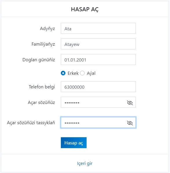 Esasy menyuda "Hasap aç" düwmesine basyň. Siz hasap açmak sahypasyna geldiňiz.Degişli meýdançalary öz şahsy maglumatlaryňyz bilen dolduryň