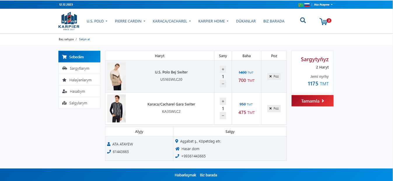 Bu bölümde "Tamamla" düwmäni basmak bilen siz sargyt etmek hereketini doly amala aşyrarsyňyz.